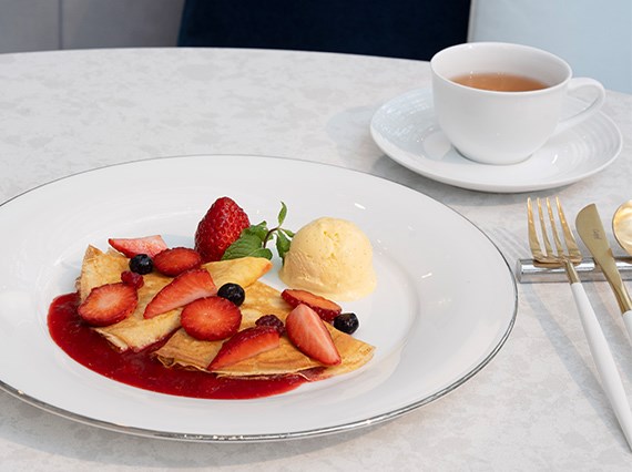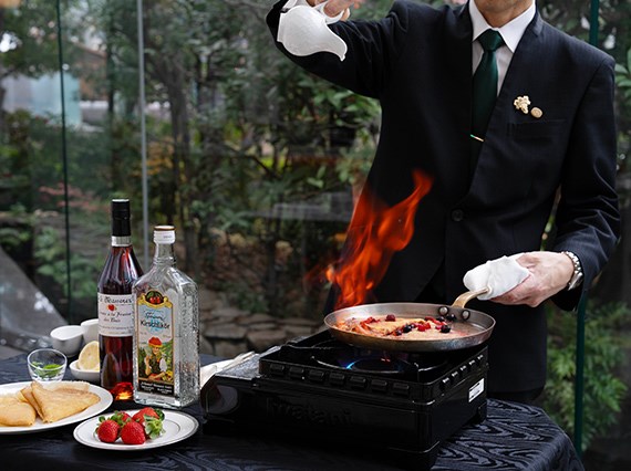 そして、コースのフィナーレには、主役の「目の前で仕立てる いちごのクレープシュゼット」が登場。いちごは2人で20粒贅沢に使用し、甘い香りと炎の演出で特別なひとときをお過ごしいただけます。